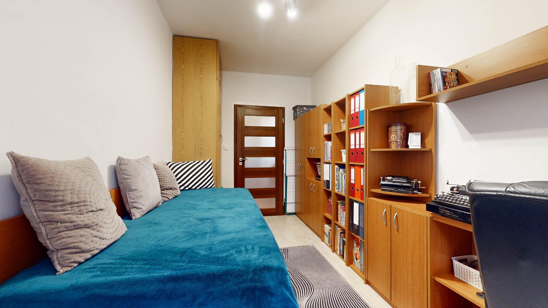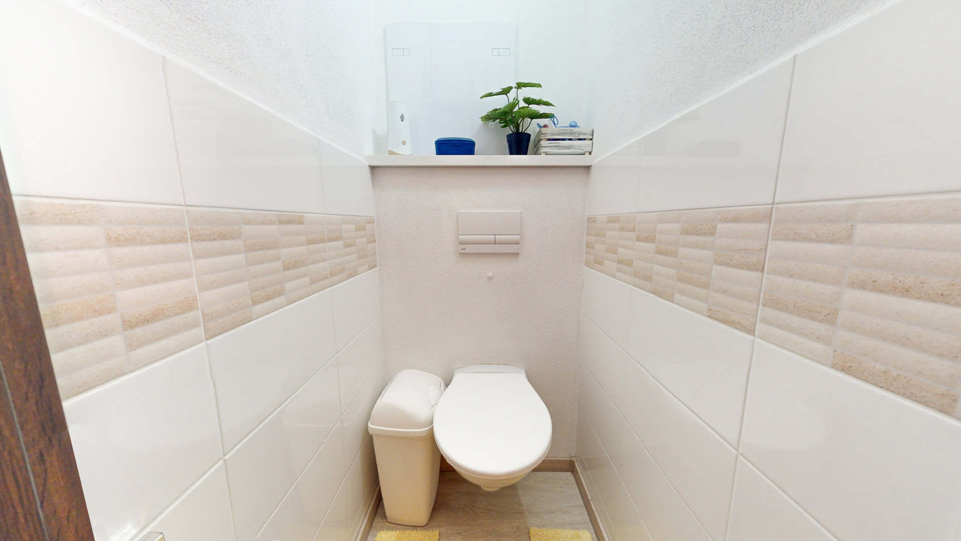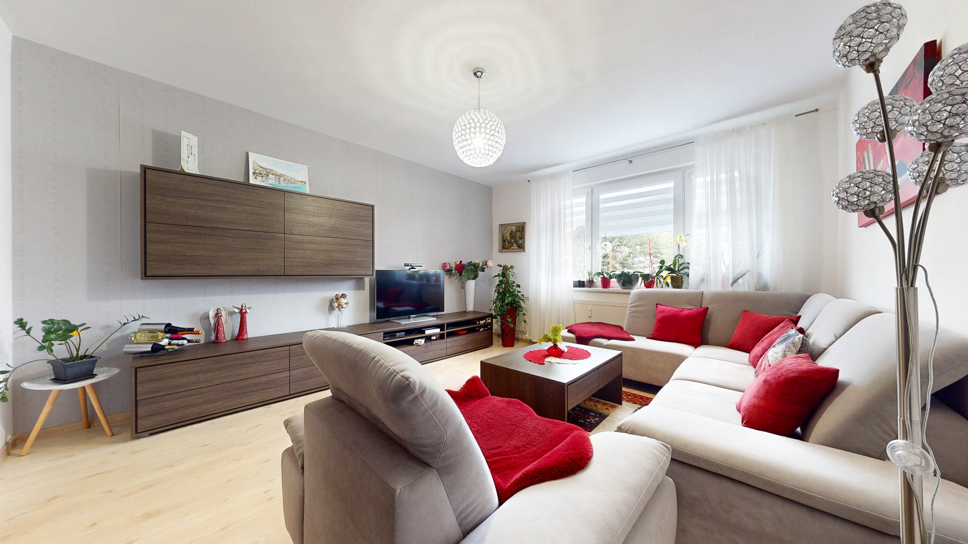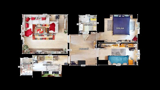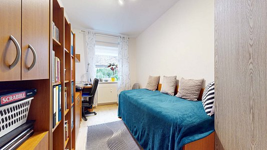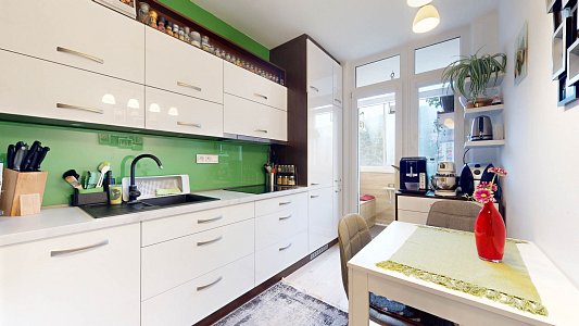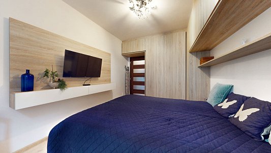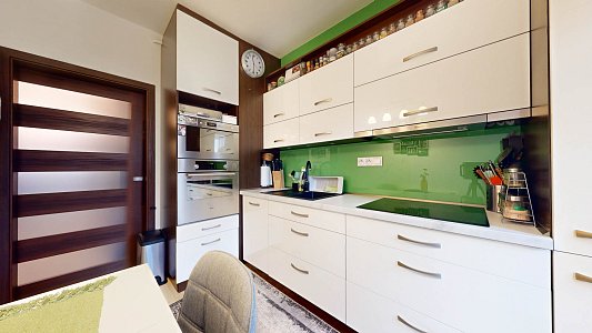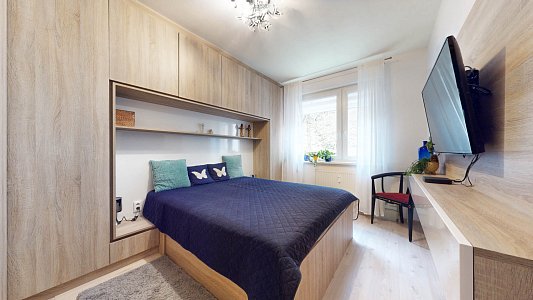 Pozostáva z troch izieb, kuchyne, kúpeľne, samostatného WC a chodby. Prešiel postupnou kompletnou rekonštrukciou od roku 2014 - rozvody elektriny, rozvody vody, stierky, rekonštrukcia kúpeľne a WC, nová kuchynská linka. V izbách sú vymenené laminátové podlahy a vinylové podlahy v chodbe, kúpeľni a vo WC. Okná sú plastové.